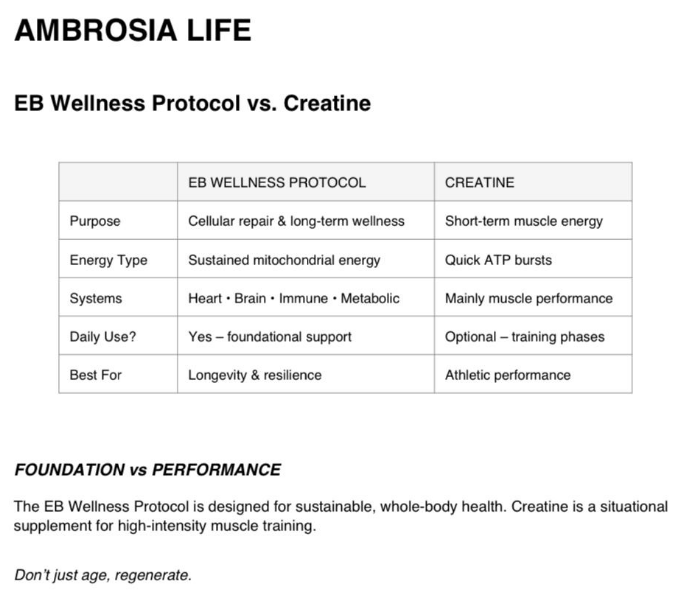 If your goal is sustainable energy, healthy ageing, and cellular resilience, consistency with the EB Protocol matters far more than adding creatine.